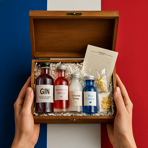 Un kit cocktail tricolore pour faire pétiller le 14 juillet. Gin, fraise, coco & curaçao : à siroter sous les feux d’artifice !